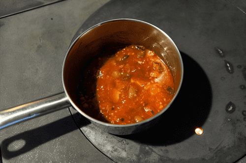 Приготовить соус. Для этого в сотейник выложить протертые томаты, оливки, мелконарезанный репчатый лук, предварительно обжаренный до золотистого цвета, измельченный чеснок, а также каперсы. Все это довести до кипения, убавить огонь и оставить на 30 минут. За это время соус выпарится примерно в два раза.