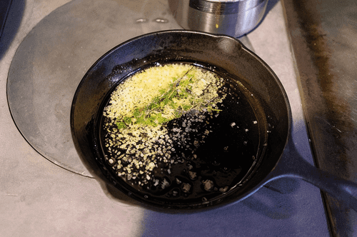 В чугунную сковороду (или другую сковороду с толстым дном) влить растопленное сливочное масло и капнуть немного оливкового. (Мне нравится смешивать масла, так вкуснее.) Добавить мелко нарубленный лук-шалот. Добавить измельченный чеснок, пару-тройку веточек тимьяна, по щепотке соли и перца.