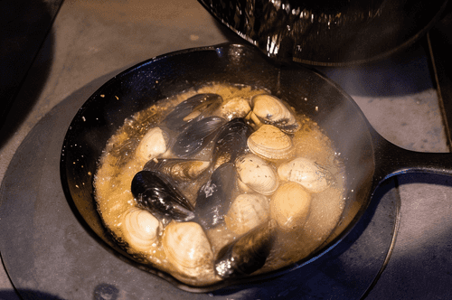 Через 5 минут добавить ракушки и херес или любое другое крепленое вино. Алкоголь быстро выпарится, оставив потрясающий аромат.