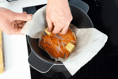 Положить на дно подушку из овощей. Для этого нарезать морковь и белую часть лука-порея соломкой или кольцами. Доложить по краям два кубика холодного сливочного масла.
