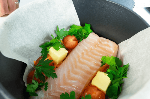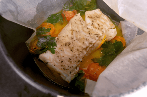 Аккуратно вытащить пергамент из кастрюли, следить за тем, чтобы рыба не развалилась.