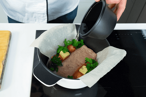 Накрыть кастрюлю пергаментом или бумагой для выпечки и накрыть крышкой. Это создаст эффект паровой бани, аромат останется внутри. Включить огонь на максимум, как только жидкость закипит (это будет слышно), убавить до среднего.