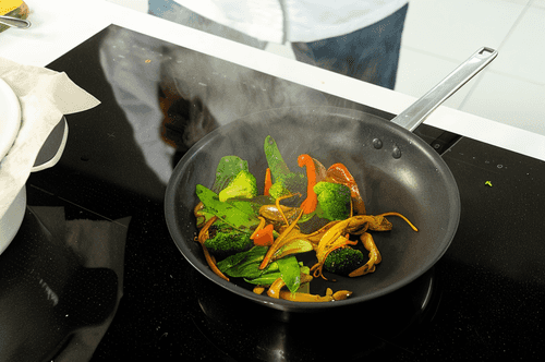 Пока рыба готовится, обжарить брокколи, вешенки, перец и горошек на сковороде, когда овощи дойдут до готовности, добавить устричный соус, сладкий соус чили, мирин, измельченный пак-чой и ростки сои. Солить овощи не нужно, устричный соус достаточно соленый.