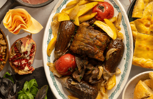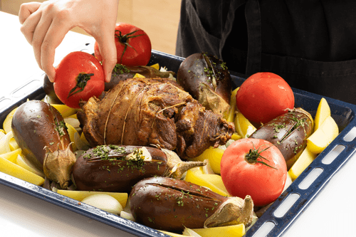 Когда мясо проведет в духовке минут сорок и будет готово наполовину, добавить в сковороду овощи: баклажаны, лук и картофель. Вернуть мясо с овощами в духовку на 25–30 минут, пока баклажаны не пропекутся, а мясо не будет полностью готово.