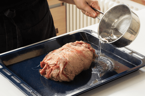 Баранину зачистить от пленок и жил, посолить, поперчить, выложить в большую форму для запекания (размера должно быть достаточно, чтобы в сковороду уместились еще и все овощи). Добавить немного горячей воды и отправить в разогретую до 180 градусов духовку на час-полтора. Периодически поливать мясо образовавшимся соком. Когда жидкость будет выкипать, подливать еще немного воды.