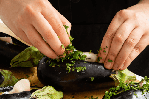 Баклажаны вымыть, обсушить и на каждом сделать неглубокий продольный надрез длиной 5–6 см. Внутрь разреза засыпать щепотку соли. Сало нарезать тонкими ломтиками, присыпать солью и перцем и тоже вложить в каждый разрез по кусочку. Вложить в каждый баклажан мелконарезанную зелень.