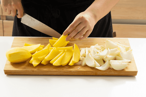 Картофель и луковицы очистить и нарезать крупными дольками.