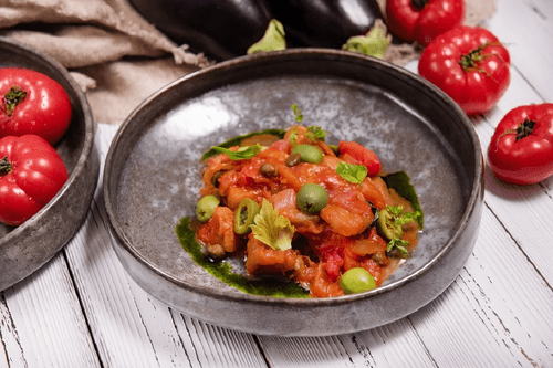 Капоната — блюдо с античными корнями, с разными вариациями его готовят по всему Средиземноморью, но лучшая капоната на Сицилии. Хотя само название испанское, обозначает в переводе «связанные в узел». Итальянец Мирко Дзаго связывает разнокалиберные овощи в единое целое при помощи соуса, в котором помидорную кислоту уравновешивают сахар, уксус и базилик. Баклажаны играют в капонате своего рода роль мяса, придавая сытности этому сугубо вегетарианскому рагу. Если под рукой не оказалось оливок именно сорта «ночеллара», их можно заменить на любые крупные зеленые оливки хорошего посола.
