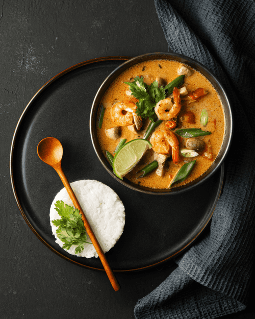 Том-ям с рисом – это яркое воплощение тайской кухни, известное своим насыщенным, пикантным вкусом. Этот суп возник в древности на берегах Таиланда и стал любимым блюдом благодаря гармоничному сочетанию остроты, кислоты и умами. Кокосовое молоко придаёт нежность, а лайм и галангал – свежесть и экзотическую нотку. Креветки и грибы добавляют текстурное разнообразие, а ароматные специи создают уникальную вкусовую симфонию. Том-ям с рисом идеально согревает и бодрит, его подают как самостоятельное блюдо или в составе тайского застолья. Это не просто еда – это гастрономическое путешествие в мир насыщенных ароматов и ярких впечатлений.