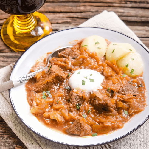 Ленивое мясо с квашеной капустой по-немецки — это уютное, деревенское блюдо, напоминающее традиционные немецкие рецепты. В его основе — нежная говядина, которая медленно тушится с луком и кислой капустой, придающей блюду яркий, слегка пикантный вкус. Квашеная капуста не только добавляет кислинку, но и смягчает мясо, делая его удивительно нежным. Томатная паста и паприка добавляют насыщенности, а чеснок — легкую пряность. Блюдо подают с гарниром, например, картофелем или хлебом, а завершает его ложка сметаны и свежая зелень. Оно прекрасно подходит для неспешных домашних ужинов, согревая и радуя своим насыщенным вкусом. Ленивое приготовление делает его удобным выбором для тех, кто хочет насладиться традиционной европейской кухней без долгих хлопот.