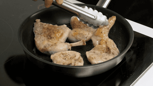 Разогреть сковородку с растительным маслом и обжарить ножки со всех сторон до золотистой корочки. Переложить обжаренные ножки в сотейник.