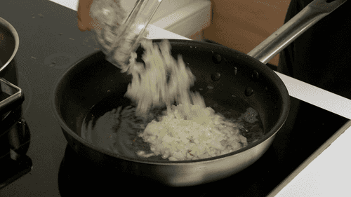 В той же сковороде обжарить мелко нарезанный лук. Переложить лук в сотейник к кролику.