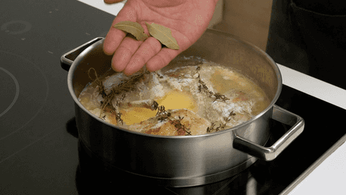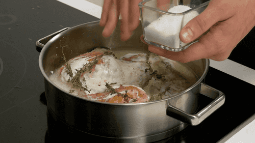 Добавить в сотейник сметану, кубики сливочного масла, тимьян, влить 200 мл воды, посолить, довести до кипения, накрыть крышкой и тушить час. Время от времени переворачивать кусочки кролика, поливая их соусом.