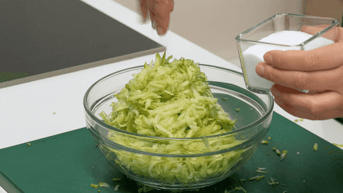 Кабачки натереть на крупной терке, немного посолить, перемешать, оставить на 5–10 минут, а затем отжать сок.