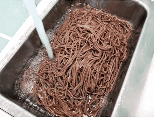 Спустя 5 минут слить воду и промыть лапшу в холодной воде.
