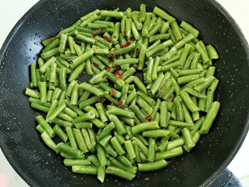 Засыпать фасоль в сковороду с небольшим количеством кипящего масла, жарить на сильном огне около 3 минут, периодически помешивая.