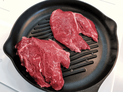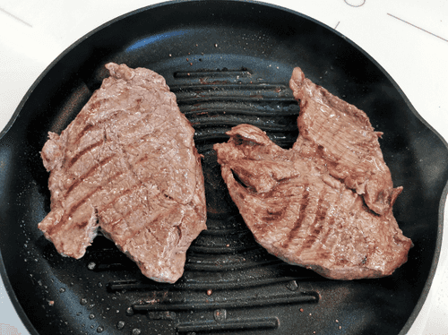 Выложить мясо на сковороду-гриль и жарить на сильном огне около 2 минут.