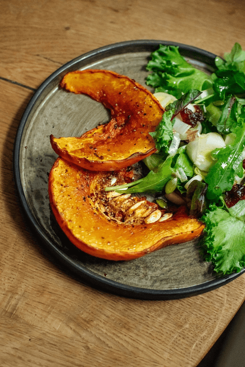 Приправить солью, смешать с вишней, семенами и выложить в тарелку с запеченной тыквой и порцией свежего салата.