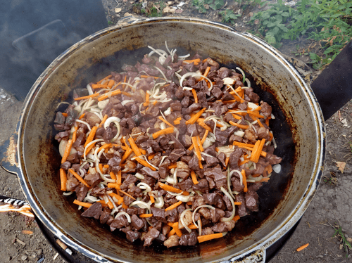 В казан заложить всю мясную нарезку, кроме печени. Она добавляется в последнюю очередь.