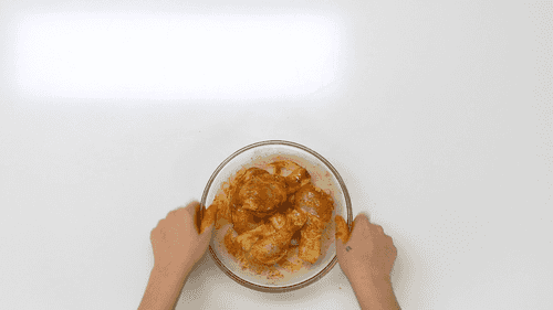 Положить к смеси специй куриные голени. Хорошо перемешать их руками, чтобы мясо покрылось ровным слоем пряной смеси.