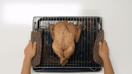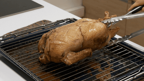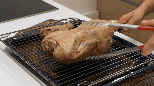 Поместить утку грудкой вверх на решетку с противнем внизу — так выделяющийся жир будет стекать на противень, и утка не будет плавать в нем. Отправить утку в духовку, разогретую до 180 градусов, на 30 минут.