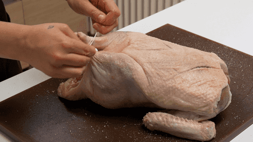 Обильно приправить утку солью как внутри, так и снаружи. Ножки утки скрестить и перевязать кулинарной нитью. Крылышки завернуть за спинку.