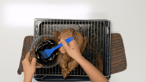 Смазать утку бальзамической смесью при помощи кисточки, особое внимание уделить грудке с надрезанной кожей. Вернуть утку в духовку еще на 30 минут, смазывая ее каждые 10 минут.