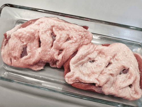 Грудку выложить в огнеупорное блюдо и надрезать шкурку в нескольких местах.