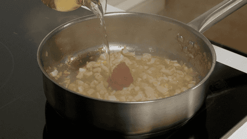 Добавить в сковороду стакан воды, довести до кипения, всыпать рис, перемешать и снять с огня. Дать рису разбухнуть 15 минут.