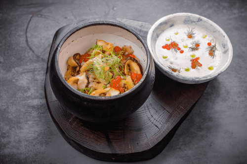 Гречневая каша с белыми грибами и красной икрой – это блюдо, воплощающее дух русской кухни. Гречневая крупа томится до нежности, впитывая аромат топленого масла, а белые грибы придают ей насыщенный вкус и лесную свежесть. Завершающий штрих – красная икра, придающая блюду изысканную солёную ноту и деликатесную текстуру. Такое сочетание ингредиентов – это гармония землистых и морских оттенков, где простота соседствует с благородством. Исторически гречневая каша была основой питания в России, но добавление грибов и икры превращает её в блюдо для праздничного стола. Подавать можно с сметаной, которая добавит мягкости и кремового оттенка вкусу. Это блюдо идеально для уютного семейного ужина или торжественного события, подчёркивающего богатство русских традиций.