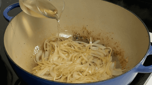 Влить к луку вино, выпарить его в течение минуты.