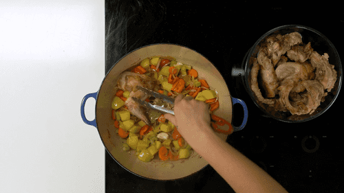 Выложить на овощи мясо кролика, залить водой, накрыть крышкой и тушить на слабом огне час-полтора.