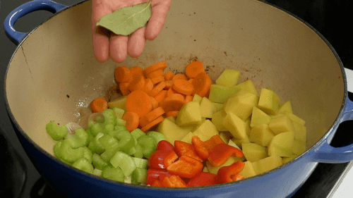 Добавить овощи, посолить, поперчить, добавить лавровый лист и перемешать.