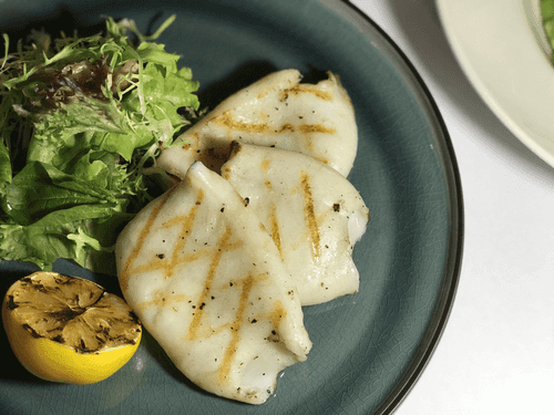 Кальмар на гриле с чесночным маслом, черри и салатом