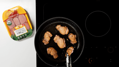 Разогреть растительное масло и на среднем огне обжарить филе куриных бедер до румяной корочки с каждой стороны. Обжаренное мясо отложить в чистую посуду.