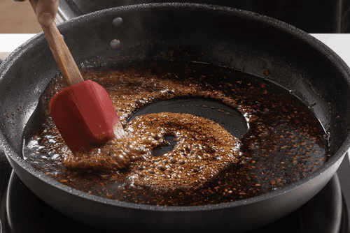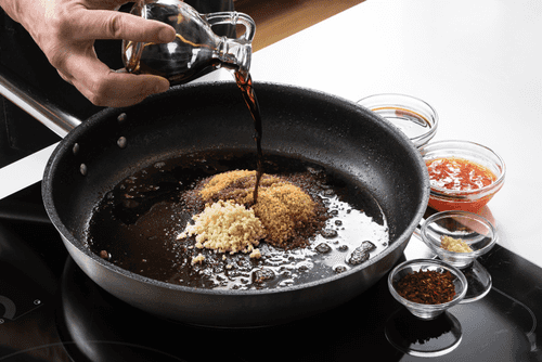 В той же сковороде смешать соевый соус, коричневый сахар, чеснок, имбирь, сладкий соус чили, терияки и сок лайма.