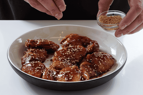 Посыпать курицу семенами кунжута и зеленым луком. Подавать сразу же.