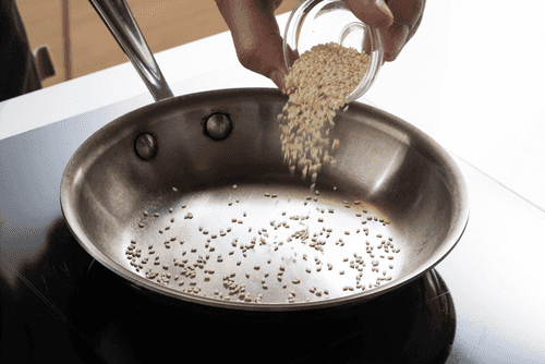 Обжарить кунжут на сухой сковороде до золотистого цвета.