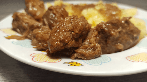 Спустя 1 час добавить к мясу соль, сахар, душистый и черный перец горошком, лавровый лист, уксус, чеснок и перемешать. Закрыть крышкой и тушить еще 1–1,5 часа, время зависит от мяса. Время от времени помешивать. По желанию можно добавить еще 50–100 мл воды, если нужно побольше подливы. Но это может не потребоваться, если сам кусок мяса был сочный, а не сухой.