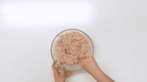 Перемешать фарш руками и отбить его.
