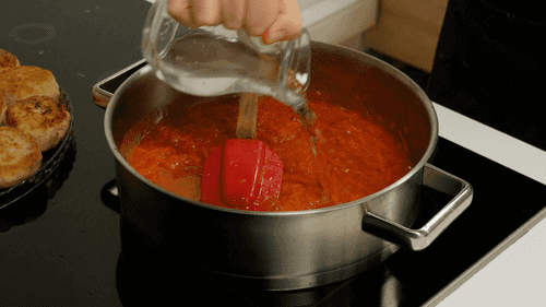 Влить пассату и воду, добавить соль, перец и сахар по вкусу. Довести до кипения.