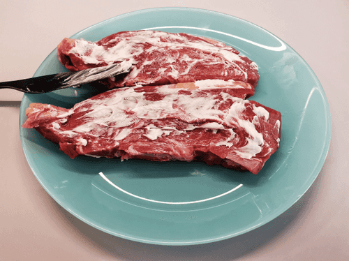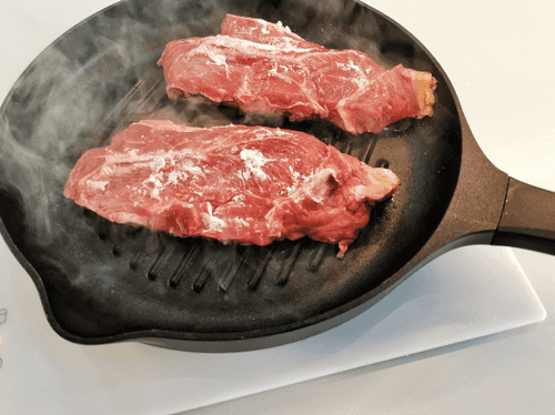 Выложить стейки специями вниз на раскаленную сковороду-гриль.