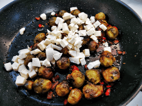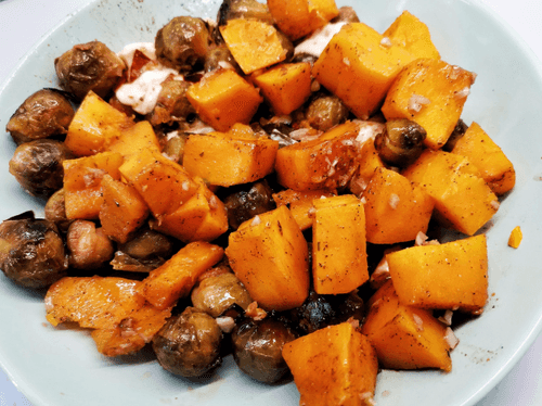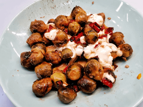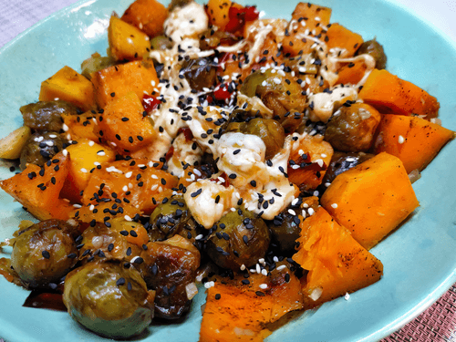 Этот рецепт запеченной брюссельской капусты с тыквой — истинное воплощение гармонии вкусов. Родом из европейской кухни, он сочетает в себе нежность тыквы и легкую хрусткость капусты, обогащенную ароматом чеснока и пикантностью перца рамиро. Исторически брюссельская капуста была популярным овощем в Бельгии, а ее запекание придает ей приятную карамелизированную нотку. Добавление моцареллы делает блюдо еще более насыщенным и мягким, а соевый соус и лимонный сок придают тонкий баланс вкуса. Это идеальный гарнир или самостоятельное блюдо, которое отлично сочетается с мясом или рыбой. Блюдо не только вкусное, но и полезное — богатое витаминами и антиоксидантами. Прекрасный выбор для уютного семейного ужина!