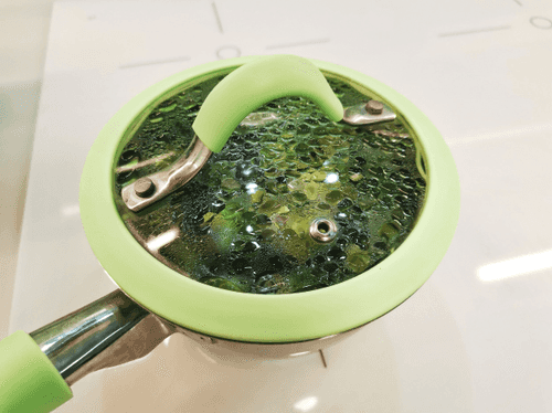 Капусту погрузить в кастрюлю с кипящей подсоленной водой, накрыть крышкой и готовить на среднем огне 10 минут.