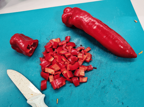 К овощам на сковородку добавить нарезанную моцареллу через 1–2 минуты после чеснока, перемешать.