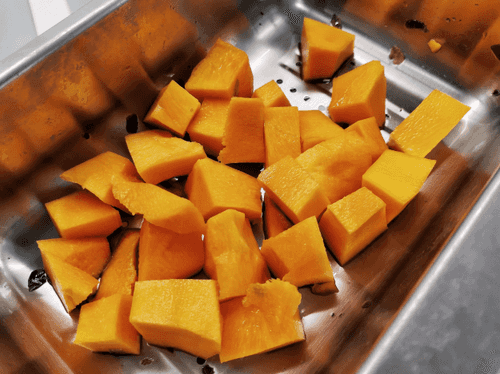 Тыкву вытащить из духовки и проверить на мягкость вилкой. Если тыква внутри все еще жесткая, продолжить готовить ее в духовке некоторое время.