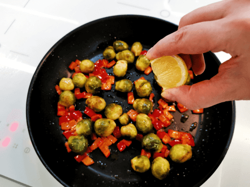 Через 3 минуты перемешать и сбрызнуть соком лимона.