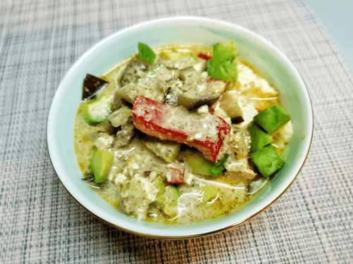 Снять с огня, выложить в блюдо и добавить авокадо.