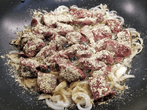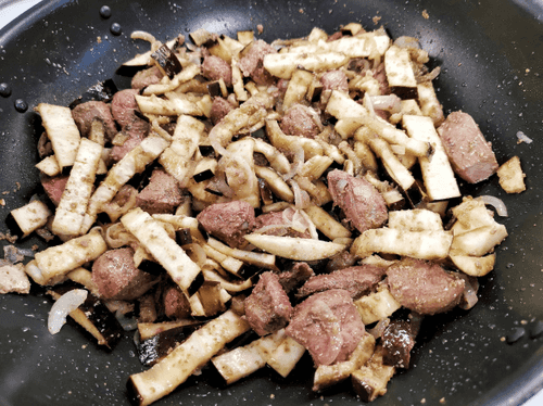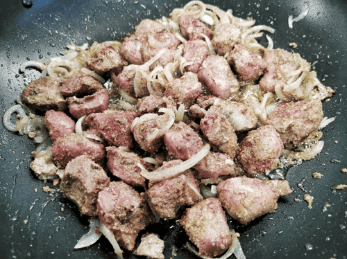 Выложить к луку мясо и убавить огонь.