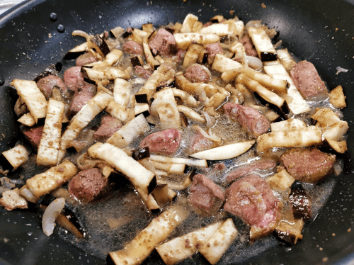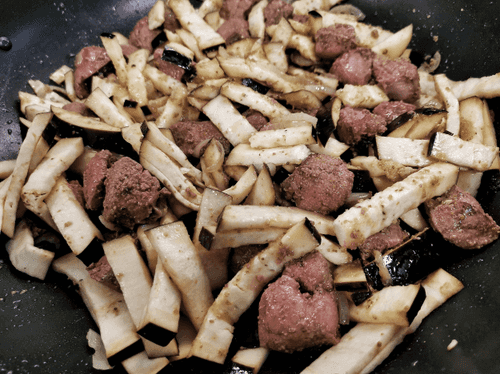 Выложить в сковороду баклажан и снова перемешать.